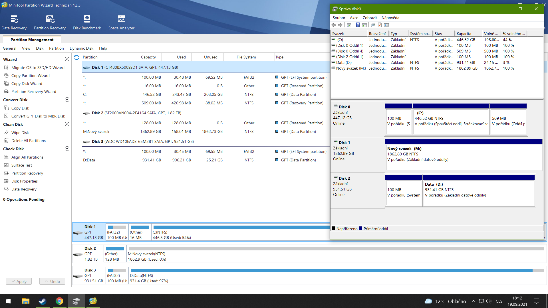 ještě bys měl "vymazat" těch 100MB na disku 2, pak, pokud to půjde, rozřířit ten oddíl co tam je s daty, nebo to nechat neobsazené ...