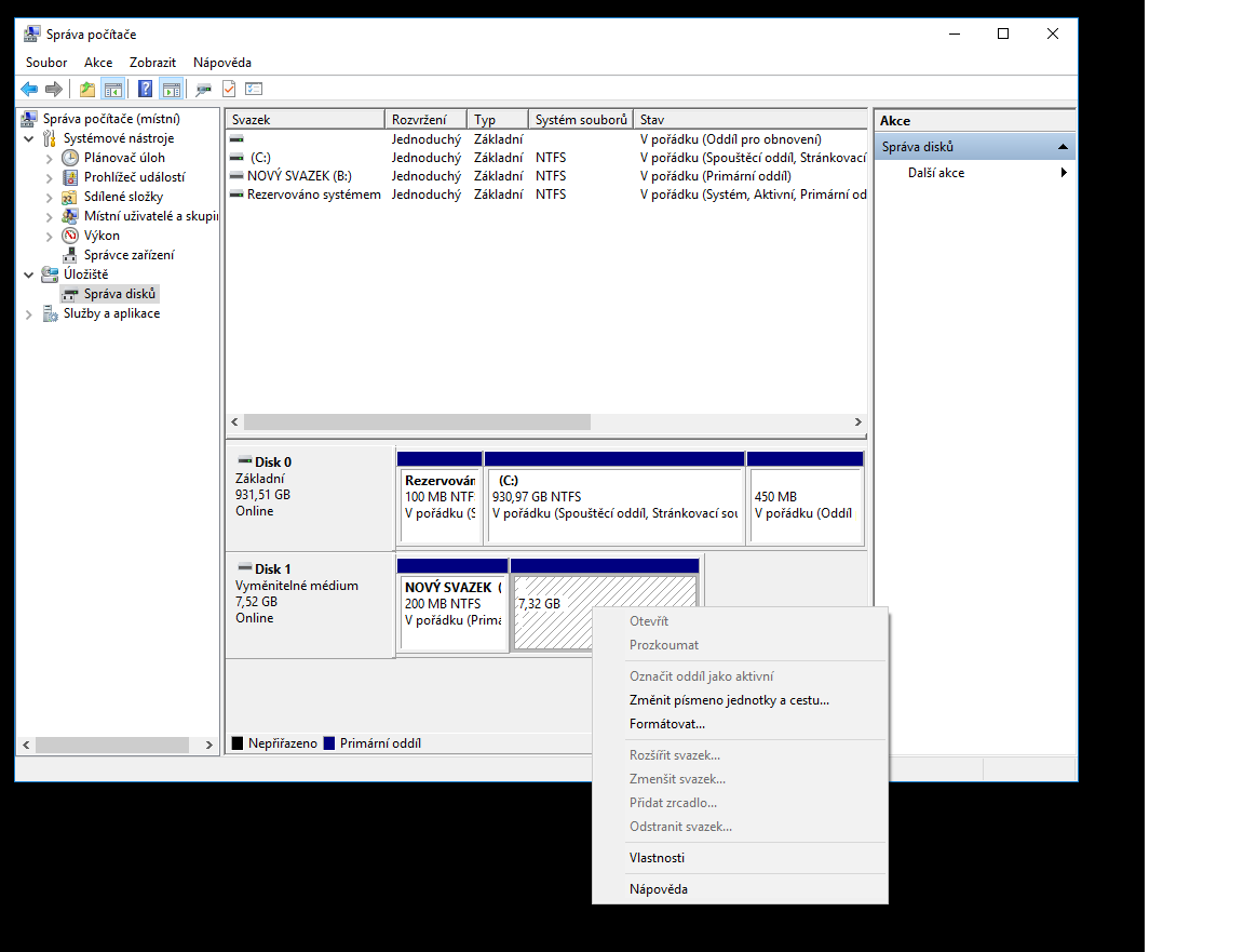 Zdravím, mám 8GB USB disk ale ukazuje mi v PC zlomek velikosti ve správě disků to nejde spojit formátoval jsem stále nic na druhou polovinu s větší kapacitou nelze připojit písmeno ani formátovat máte nějakou radu?