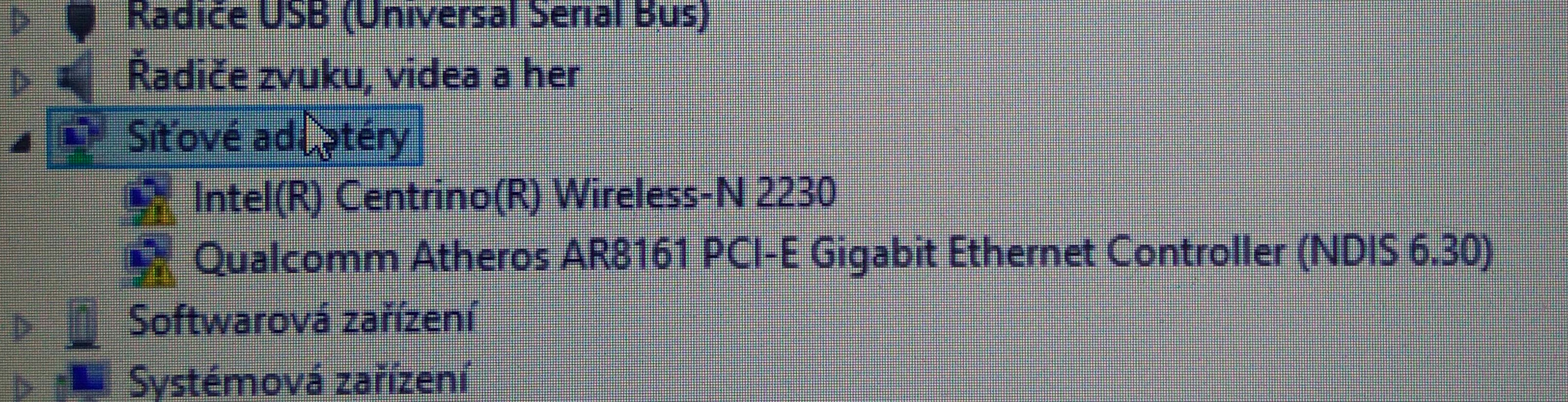Ve spravci zarizeni jsem zjistil, ze u LAN karty a WLAN karty sviti vykricnik. Obe jsem odinstaloval, restartoval a nainstaloval ovladace z Driverscape, jelikoz na strankach vyrobce ovladac na Wifi neni.