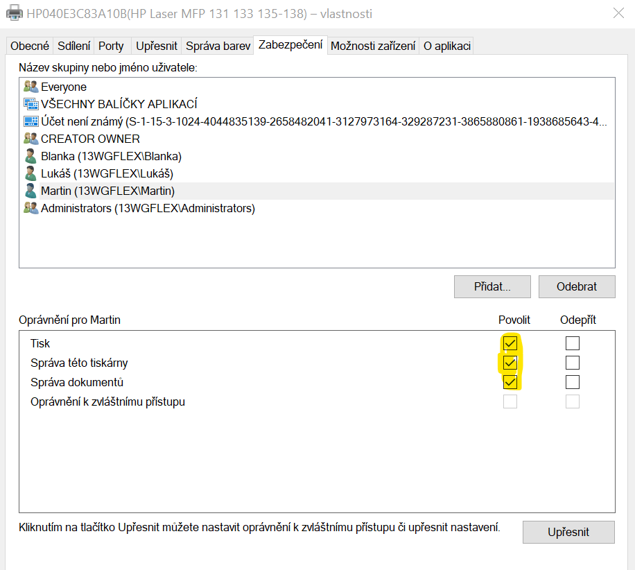 Tak v nastavení skeneru nemám možnost nastavit přístupy: Pouze u tiskárny, ale jelikož to je jedno zařízení, tak by to mělo platit asi i na skener: Nastavil jsem vše stejně:atari píše:Pokud si dobře pamatuji, tak v nastavení tiskáren bývá záložka zabezpečení. Tak bych na to zkusil kouknout a případně tam všude nastavit hodnoty "Everyone".