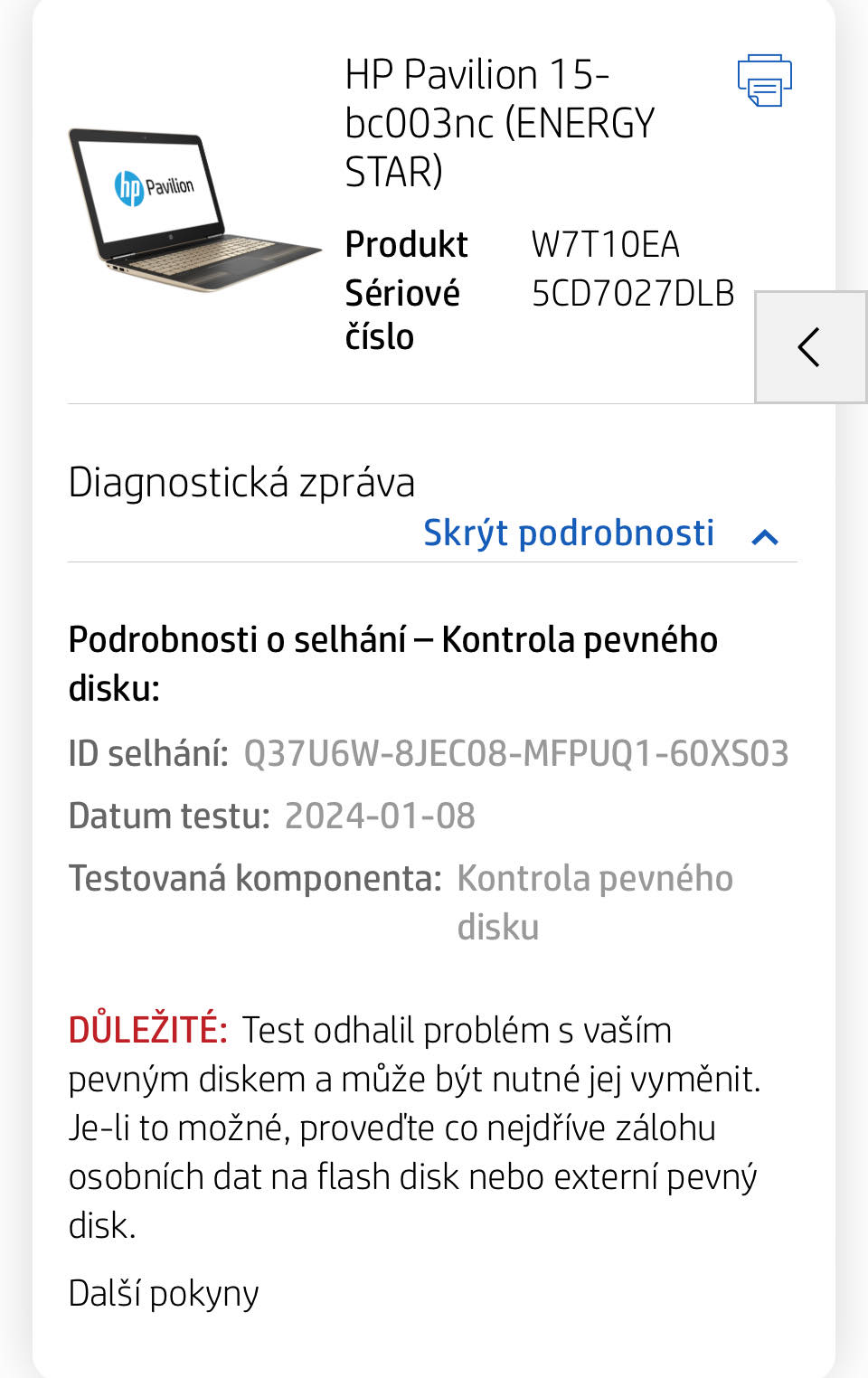 Diagnostika HP mi odhalila problém s pevným diskem a že může být nutné jej vyměnit. To jsem u notebooku nikdy nedělal, nevím, jak je to složité a oprava asi nebude levá.