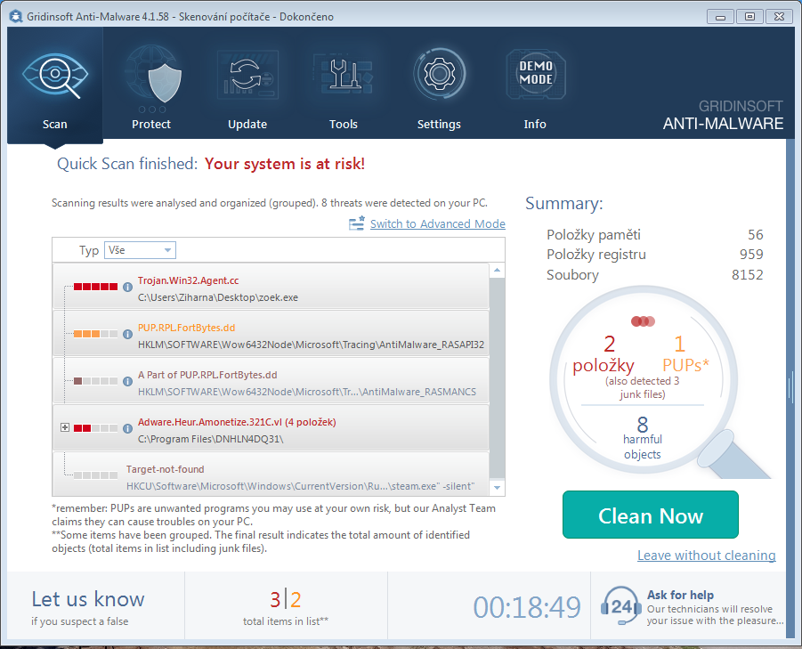 Ještě jsem to projel Malwarem od GridinSoftu, ale nelze přes něj smazat nákazy, ani udělat log. Je to totiž demo.