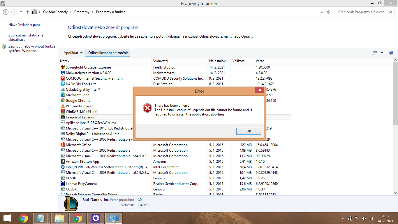 Ja sem vcera odinstaloval LOL ale vecer sem daval obnoveni systemu o par h zpatky a vratily se mi nejaky zbytky na C a do ovladaci panely- programy a funkce se to taky vratilo a ted to nejde odinstalovat. hodim ti screen