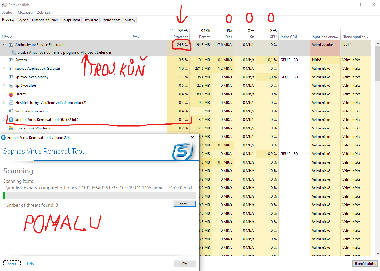 "Důkaz", že tam ten Trojan pořád je. A Defender ho neodstraní. Schovává se za proces Defenderu a hlídá si zatížení CPU do 20%, asi aby nebylo poznat, ale roztáčí mi ventilátor na BOX chladiči CPU, takže o tom dobře vím. Jinak je teď standardní zatížení CPU cca 1% naprázdno. Malwarebytes ho vyřadí /nahradí proces Defenderu/, ale třeba AdAware NE! /Zkoušel dříve/. Tak pokračuji ...