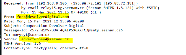 Zdravím, na YouTube produkuji určitou tvrobu. Přišla mi nabídka z emailu @gmail.com, která se tvářila jako od DevolverDigital. Při odpovězení na mail, jsem napsal proč není email poslán z oficiálního emailu společnosti DevolverDigital a to z @devolverdigital.com. Následne mi přišel email že se jedná skutečně o ně. Nicméně při rozkliknutí hlavičky emailu na mě vyskočilo toto. Na základě tohoto usuzuji, že se jedná o podvod. Rád bych ale ještě povrzení někoho z vás. Předem děkuji za odpověď.