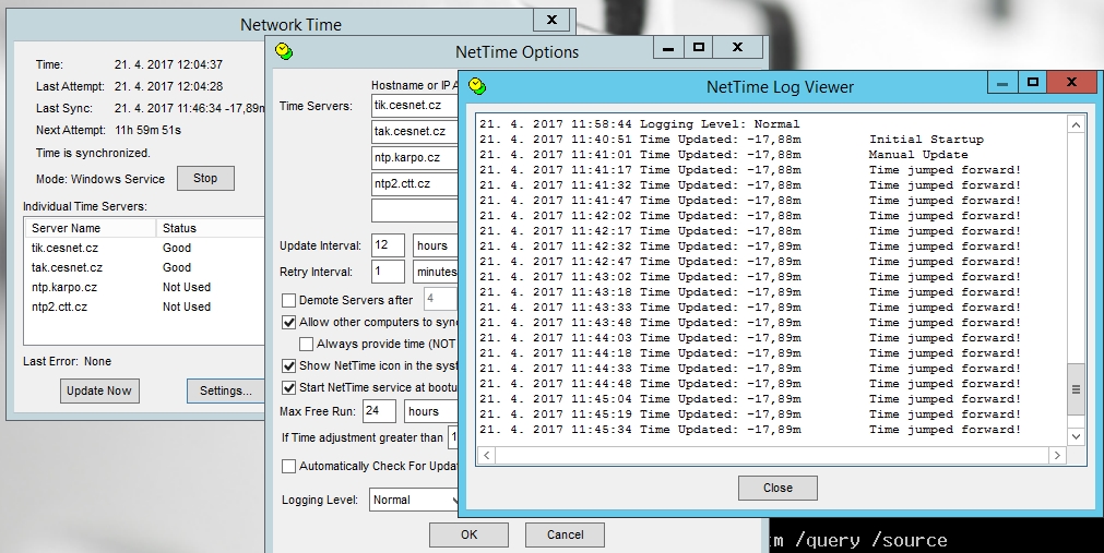Pokud dám w32tm /resync /force - čas naskočí správný, ale během pár vteřin se objeví hláška v logu Time jumped forward!