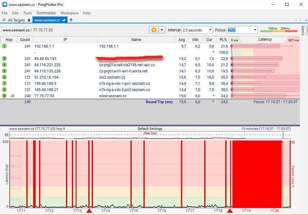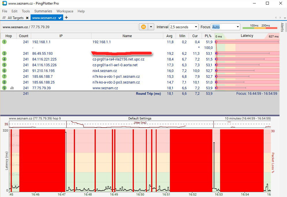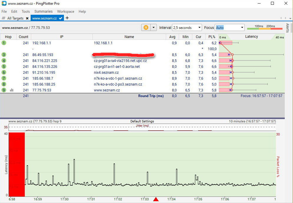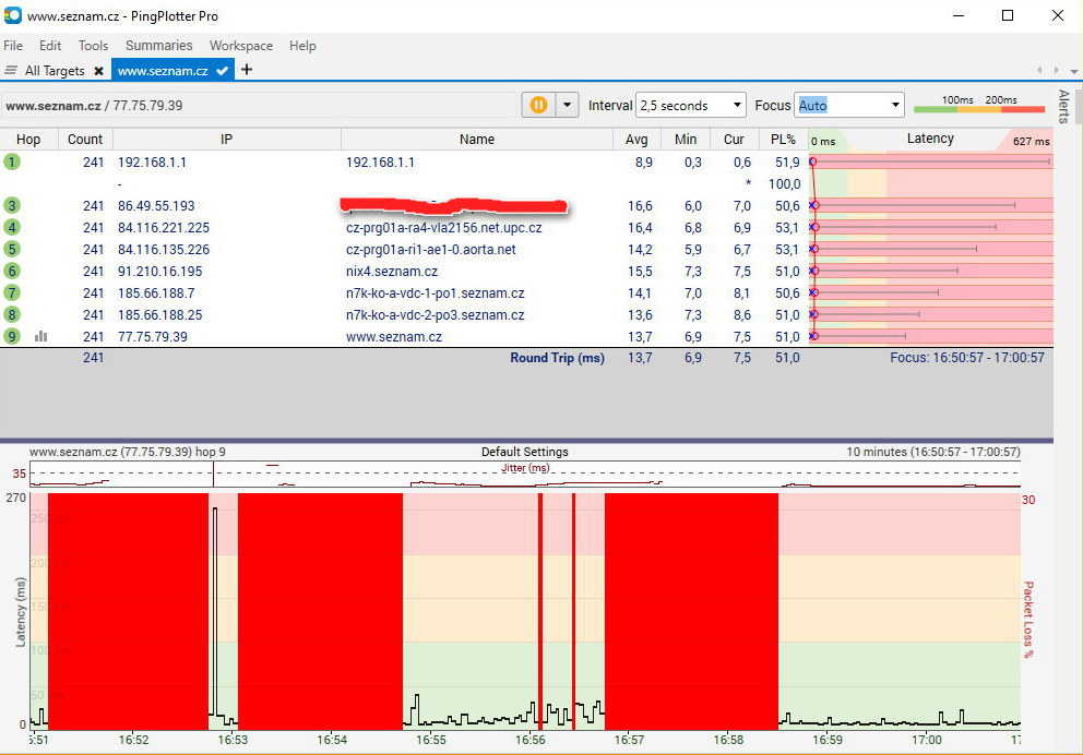 Tak při pingování Seznamu.cz mě připojení odumřelo. Jinak ten Pingploter ukázal docela děs běs.
