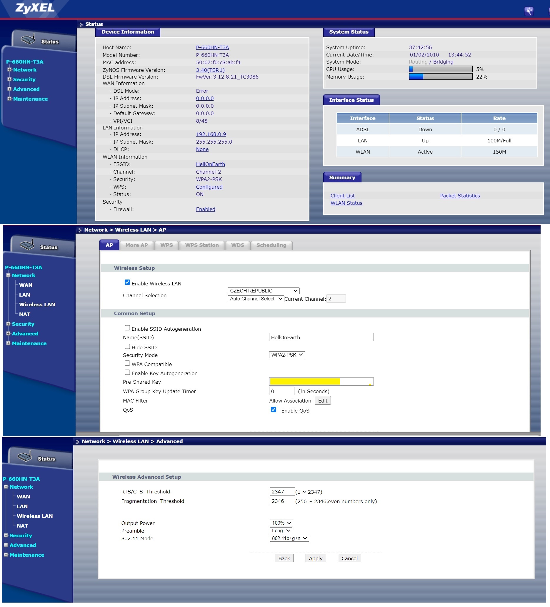 Tedy SSID na zyxelu bude HellOnEarth, oba dva musí být WPA2-PSK a stejné šifrování - nejlépe AES.