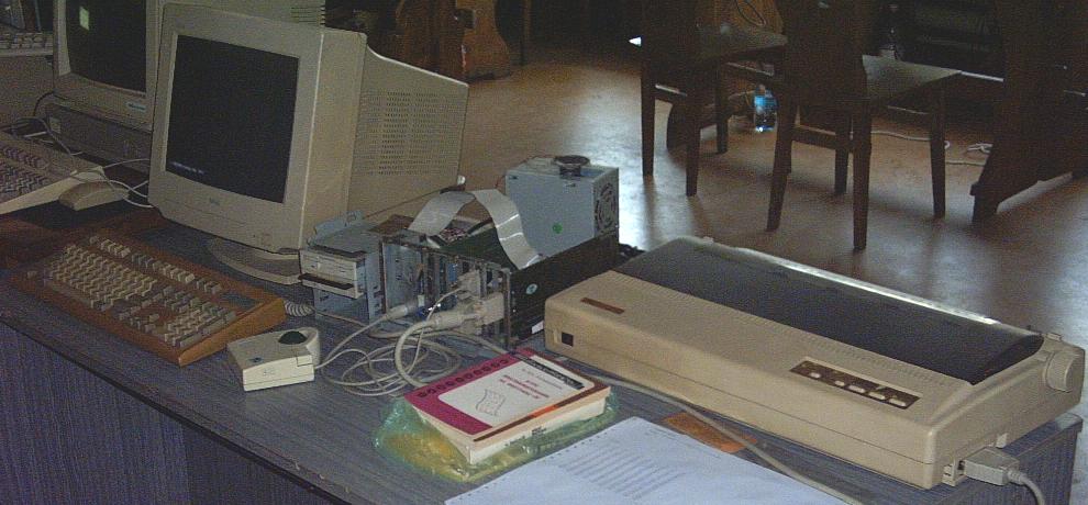 Základní deska byla sice na plechu, ale AT zdroj a rámeček s disketovkami ležely volně kolem, a za těmi disketovkami se krčí položený síťový vypínač s kabely přímo ze zdroje, který má na konektorech plných 240 voltů!