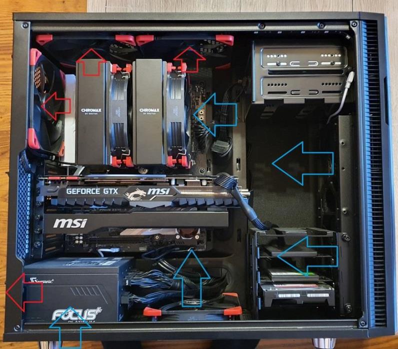 Trochu nechápu tvou reakci na zdroj zezadu? Pokud se dobře podíváš, tak ten s vnitřní airflow nemá nic společného a samostatně nasává zvenku a ven zase vyfukuje.