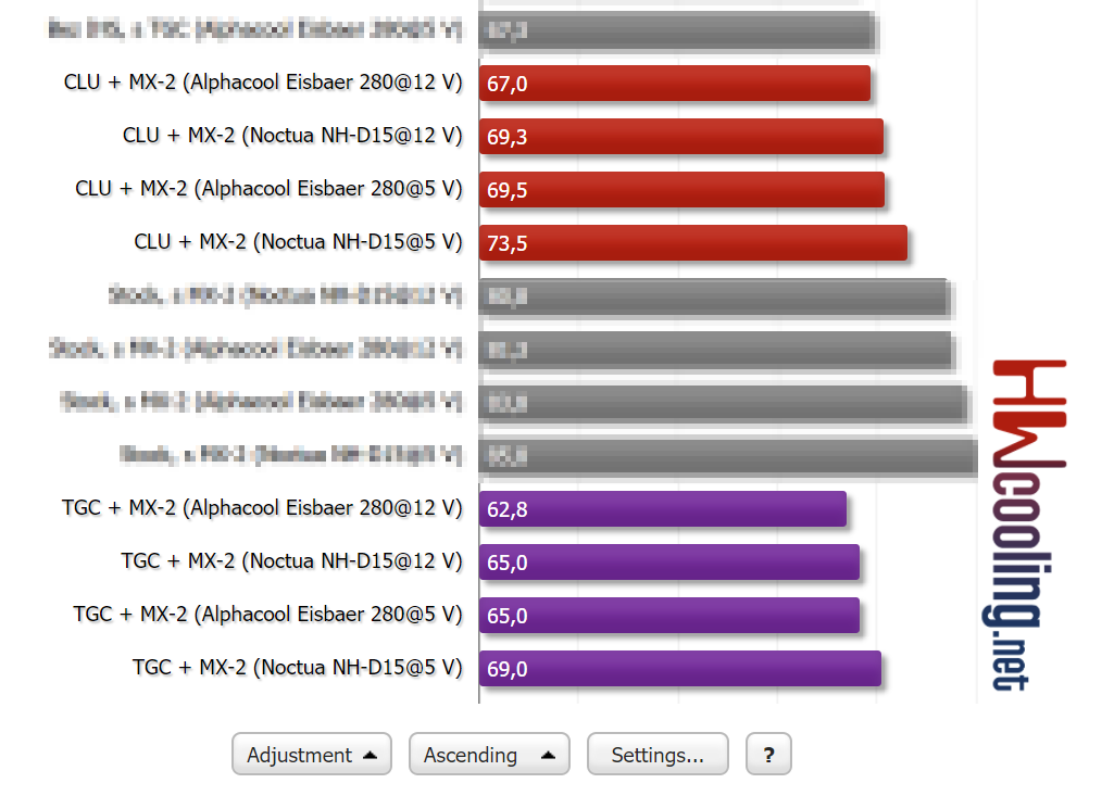 Po vysledkoch TGC + MX-2 vs. CLU + MX-2, kde v styroch roznych situaciach CLU straca 4 – 4,5 °C, testovanie s 2× CLU nemalo zmysel. K dobru oproti CLU + MX-2 by to bolo menej nez 2,5 °C, co je rozdiel medzi 2× TGC vs. TGC + MX-2 :)