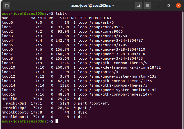Zbývá ti tak jenom disk mmcblk0, který má dva oddíly: mmcblk0p1 a mmcblk0p2. Ten druhý je /, tedy kořen adresářového stromu, ten první je do něj připojený v adresáři boot jako podadresář efi. Kam je co připojené vidíš vpravo ve sloupci MOUNTPOINT. Pokud tam nic nevidíš, není to připojené nikam.