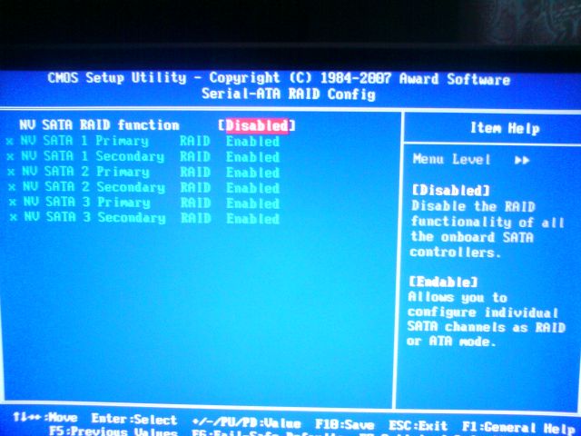 Na stránce BIOSu Integrate Peripherals na řádku Serial ATA RAID Config, klikni na press Enter a vlož sem co tam je nastavené. Stejně tak na stránce Advanced BIOS Feature na řádku Hard Disk Boot Device, to rozklikni na Press Enter a vlož sem to nastavení.