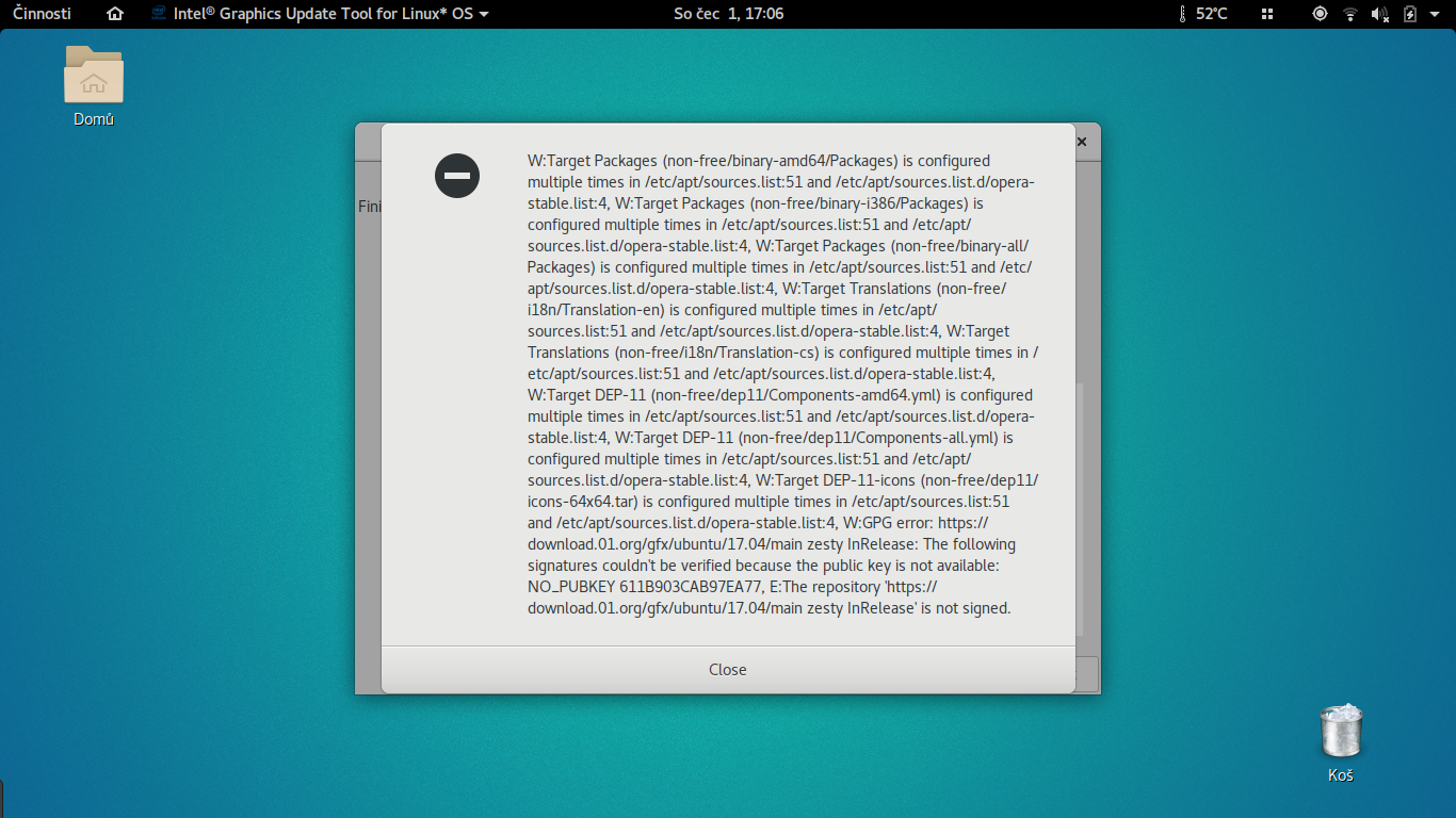 W: Chyba GPG: https://download.01.org/gfx/ubuntu/17.04/main zesty InRelease: Následující podpisy nemohly být ověřeny, protože není dostupný veřejný klíč: NO_PUBKEY 611B903CAB97EA77