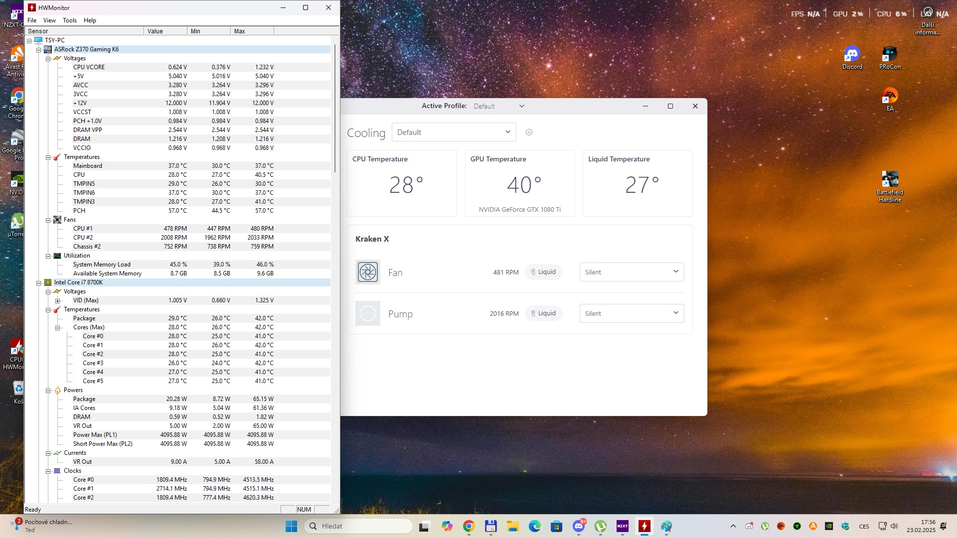 Ještě mě napadlo zkusil odpojit a připojit zbývající 2 kabely, jestli nebyly nedotažené, ale to nepomohlo. Potom jsem zkusil postupně převrátit PC na všechny možné strany, když jsem ho dal vzhůru nohama, tak jsem slyšel, jak v tom překapává ta kapalina. Potom jsem ho dal zpět do normální polohy a zkusil zapnout a při startu jsem prvních pár vteřin slyšel, jak v tom chladiči proudí ta kapalina. Větráky tentokrát však už nezrychlily a podíval jsem se, jak to vypadá a voala najednou je všechno v pořádku, pumpa se chová normálně a teploty jsou též normální: