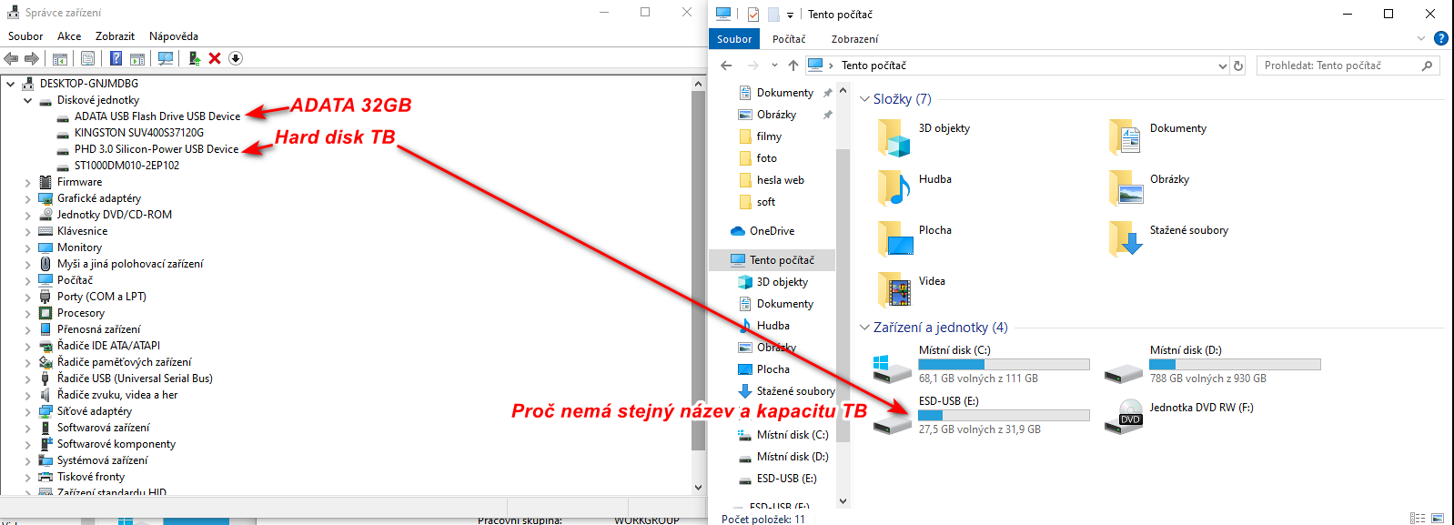 Připojil jsem ještě jedno zařízení : externí disk 1TB a tomu nerozumím už vůbec proč má 32GB ? Ta kapacita patří flash disku ADATA